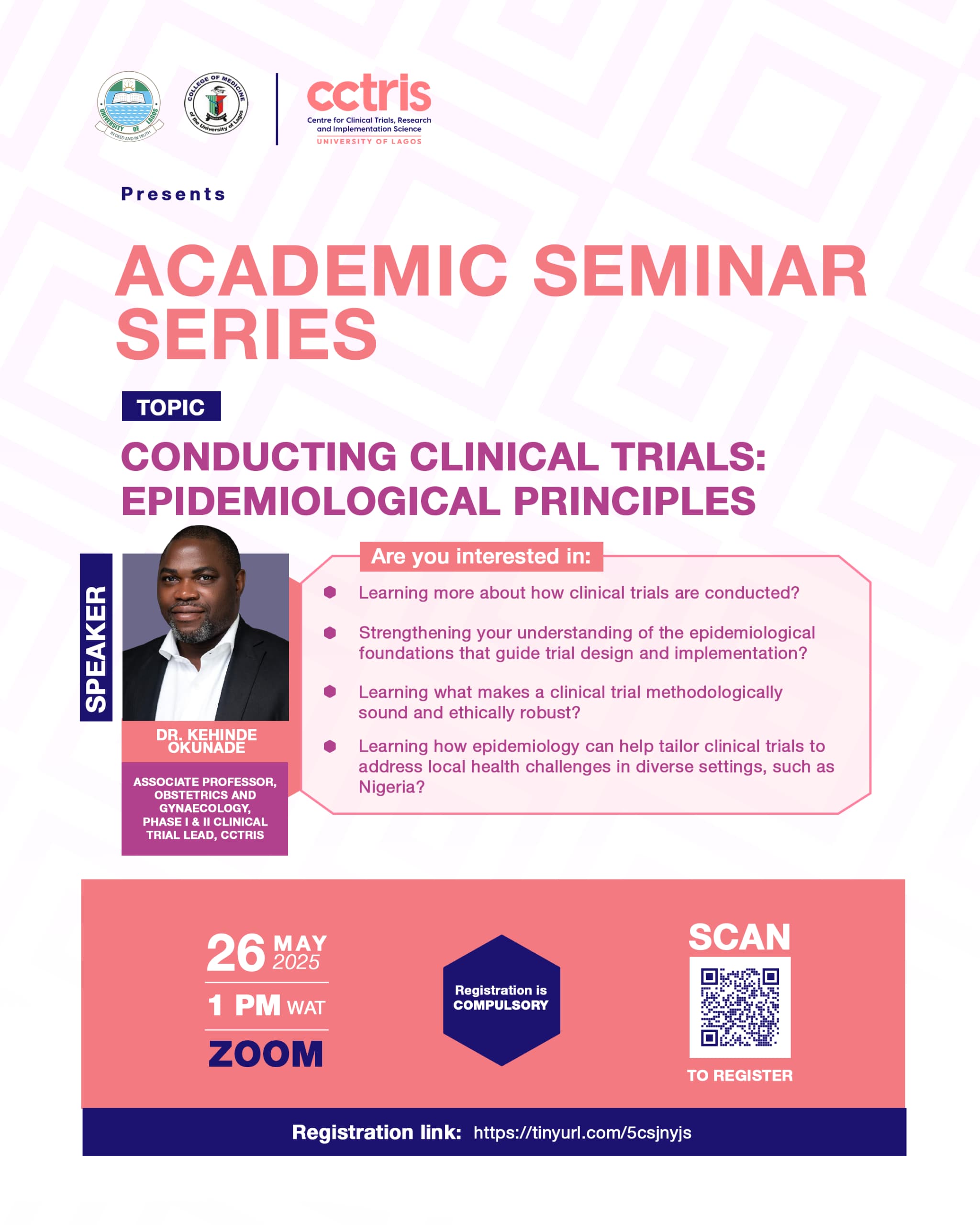 CCTRIS warmly invites you to its first Academic Seminar of 2025 titled "Conducting Clinical Trials: Epidemiological Principles." This virtual session, taking place via Zoom on 26th May 2025 at 1 PM, will be led by Dr. Kehinde Okunade, Associate Professor of Obstetrics and Gynaecology and Phase I and II Clinical Trial Lead at CCTRIS.